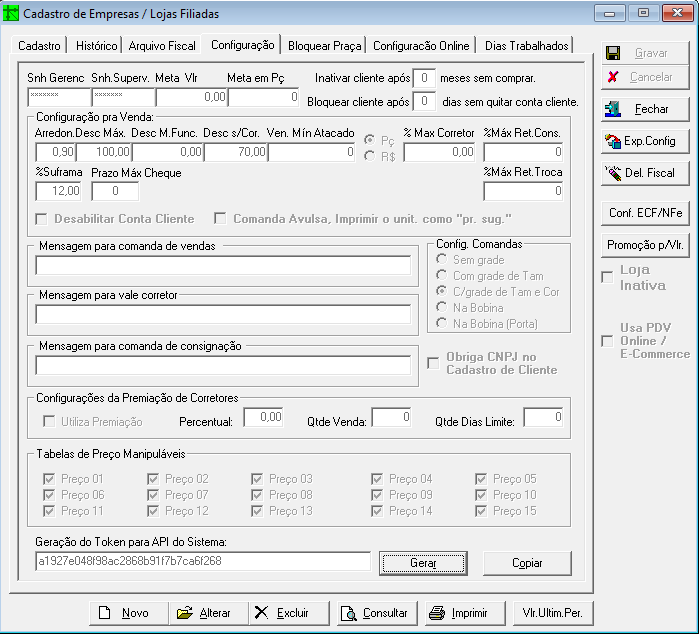 No sistema alphaind, módulo comercial, menu cadastro, opção Empresas/Lojas, na aba Configuração,